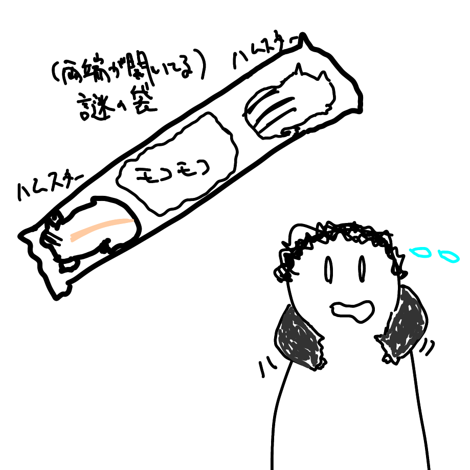 そして、その二匹の持ち帰り方法がまた謎で、両端が開いている袋のようなもの、筒状の布袋にハムスターを入れ、その両端の口近くにハムスターを入れる?という方法であった。(謎)