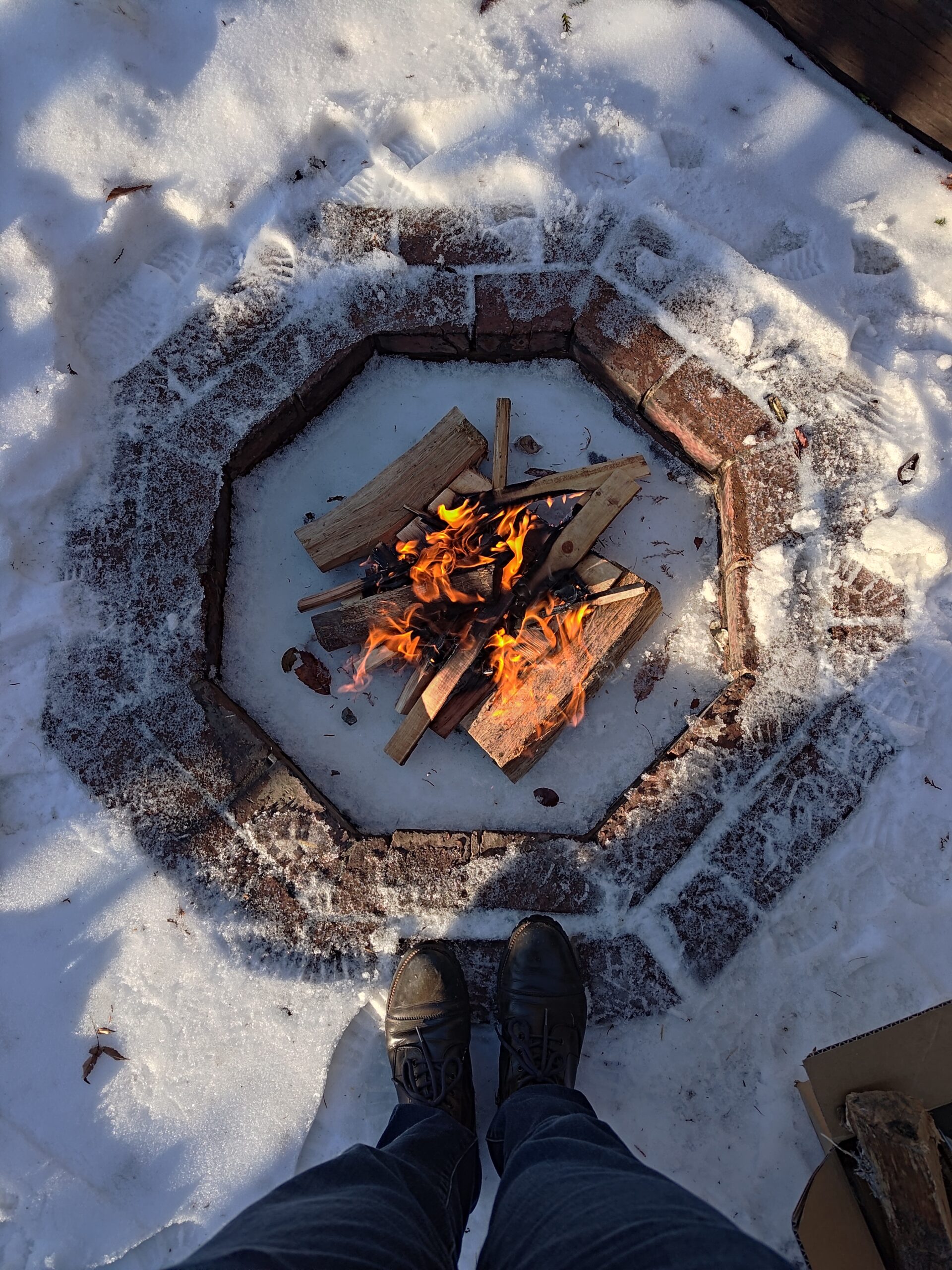 チェックインして荷物を置いたら、さっそく焚き火を始めた。地面は雪で覆われていた。